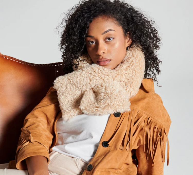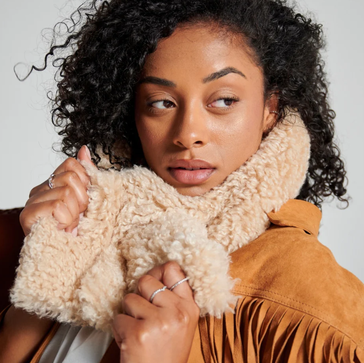 Più di una semplice sciarpa, una vera coccola portatile. Realizzata in morbidissimo teddy bouclette beige chiaro, si chiude con un solo movimento grazie a un ingegnoso sistema che la mantiene saldamente in posizione, anche quando soffia il vento.