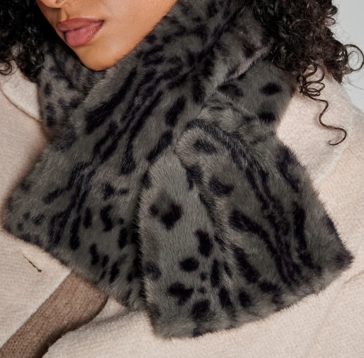 Una sciarpa che rimane al suo posto e ti tiene al caldo tutto il giorno. Morbidissima, con una fantasia leopardata grigia di tendenza, si trasforma in un elegante collo di pelliccia con un solo gesto.