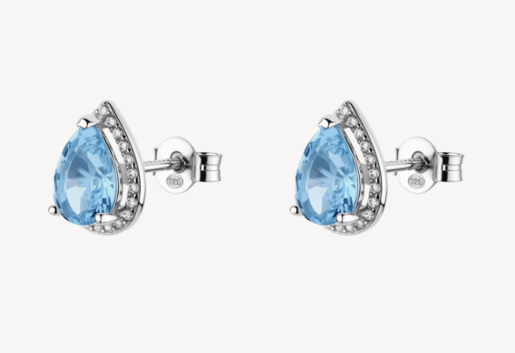Orecchini a lobo in argento rodiato 925‰ con pear cubic zirconia nei colori sapphire e light sapphire.