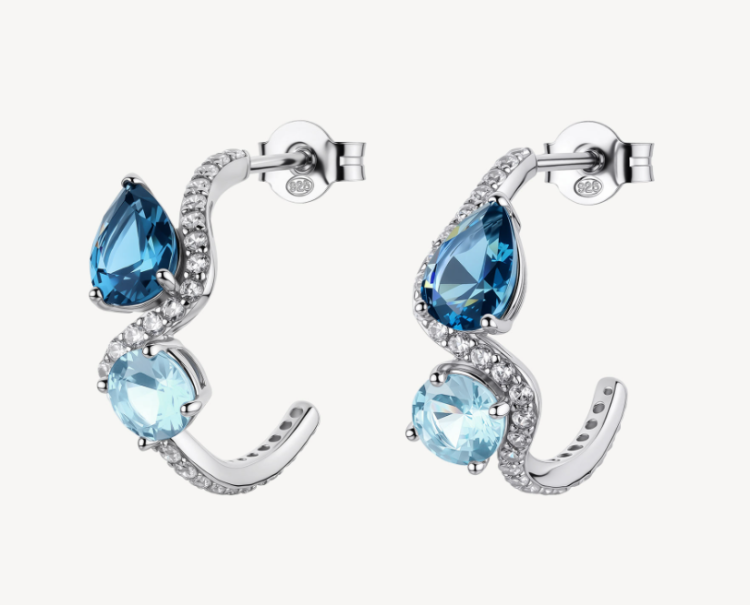 Orecchini a cerchietto in argento rodiato 925‰ con round e pear cubic zirconia nei colori sapphire e light sapphire.