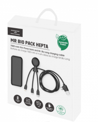 Il Mr Bio Pack Hepta è un pacchetto “tutto-in-uno” pensato per chi vuole restare sempre connesso, soprattutto durante viaggi o spostamenti. Comprende una power bank da 7000 mAh, capace di ricaricare fino a tre volte uno smartphone, accoppiata a un cavo multi-connettore lungo 1 metro che offre grande libertà d’uso.