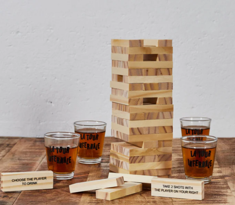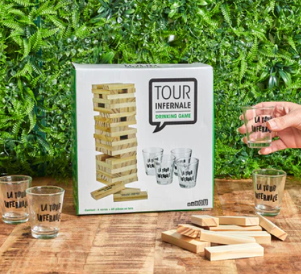 Tour Infernale – Gioco da bere: In questa versione, le classiche tessere in legno sono accompagnate da bicchieri da shot. Ogni tessera presenta una sfida o un'azione da compiere. Chi fa cadere la torre deve bere tutti i bicchieri presenti sul tavolo. È un gioco pensato per animare le serate tra amici con risate e sfide divertenti.