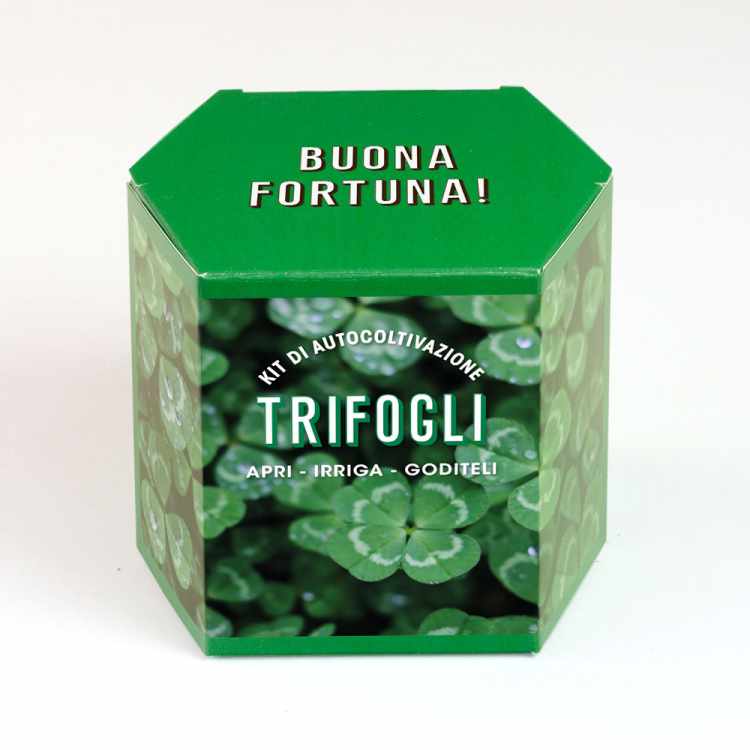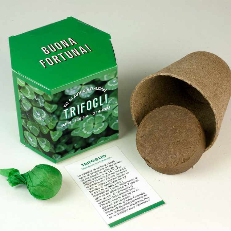 Ogni kit contiene tutto il necessario per coltivare il trifoglio: 1 vasetto di germinazione 100% biodegradabile, 1 compressa di torba, semi di trifoglio e 1 scheda con le istruzioni per la cura.