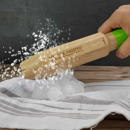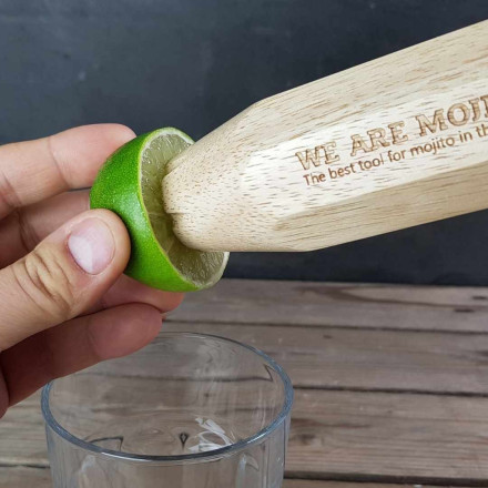 Lo strumento We Are Mojito è composto da un misuratore di rum e zucchero di canna, un martello per ghiaccio tritato, un pestello e una pressa per agrumi. Spremete il limone, tritate la menta, versate lo sciroppo e il rum perfettamente dosato, tritate i cubetti di ghiaccio e aggiungete un po' di acqua frizzante. E il gioco è fatto!