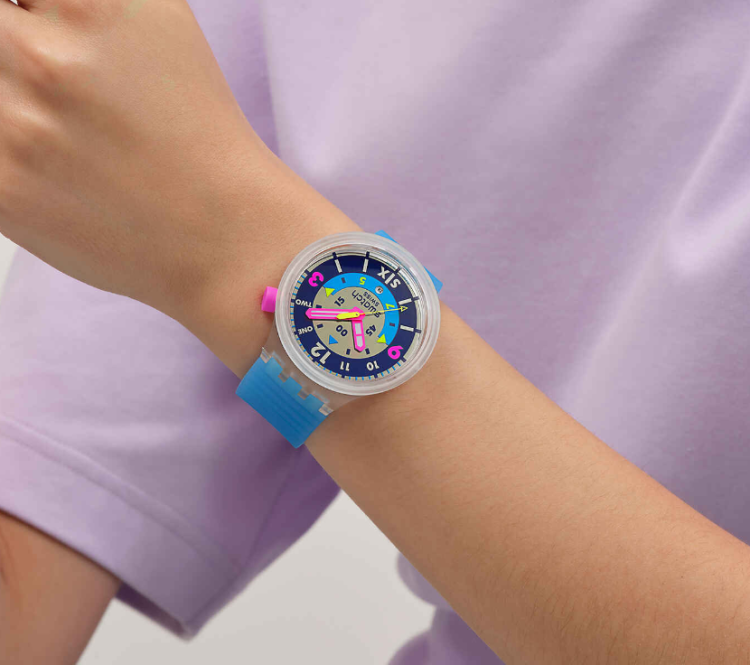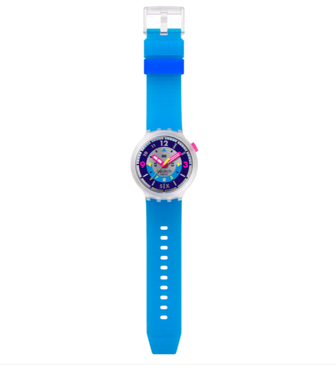 Questo orologio oversize rétro si ispira a uno Swatch LADY anni '90: lo HIELO da collezione (LK146). Le sue caratteristiche di spicco includono un quadrante con numeri stampati multicolori, numeri scritti, indici, effetto specchio e datario a ore 6. L’orario è indicato da lancette delle ore e dei minuti rosa che si illuminano al buio e da una lancetta dei secondi gialla. La cassa trasparente opaca con lunetta coordinata è completata da un cinturino blu trasparente opaco testurizzato con un passante blu scuro trasparente opaco, un passante blu trasparente opaco e una mezza fibbia trasparente opaca.