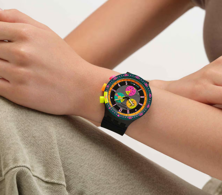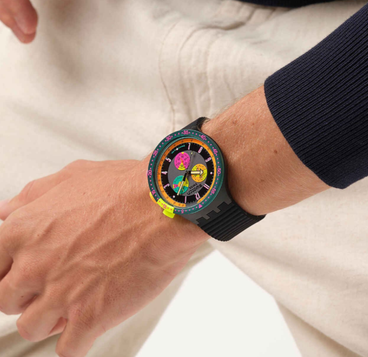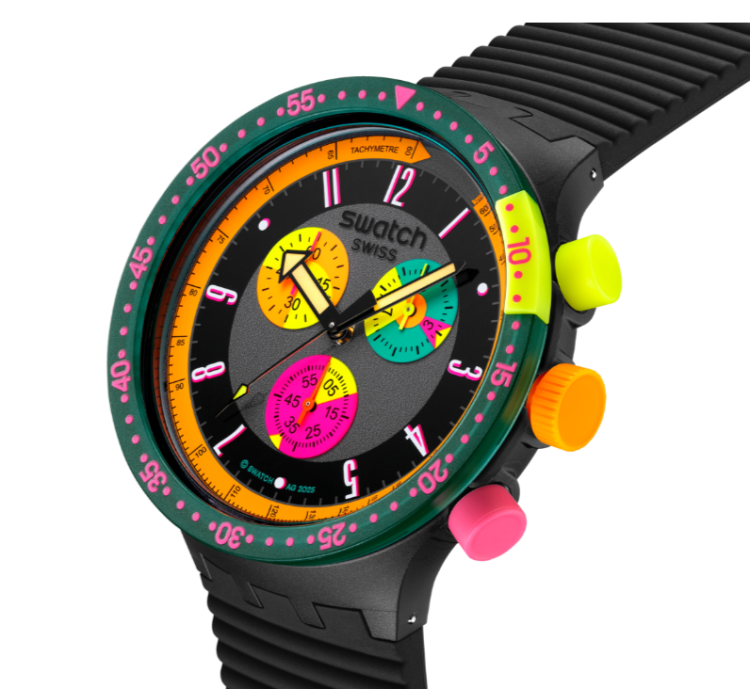 Questo cronografo oversize rétro si ispira a uno Swatch SCUBA AQUACHRONO anni '90: il SEPPIA da collezione (SBM102). Le sue caratteristiche di spicco includono numeri stampati multicolori, indici, quadranti secondari e scala tachimetrica. Le lancette delle ore e dei minuti nere si illuminano al buio e la lancetta dei secondi del cronografo nera si illumina al buio sulla punta. La cassa nera trasparente opaca presenta una lunetta trasparente color verde scuro opaco con stampa rosa e inserto giallo. Completano l’orologio un cinturino testurizzato nero opaco con passanti rosa opaco e giallo trasparente opaco e una mezza fibbia trasparente color arancione opaco.