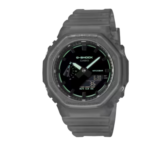 Scopri i nuovi GA-2100K, ispirati all'atmosfera suggestiva dei club e dei festival musicali. La particolarità di questi orologi è il quadrante, che ha un aspetto nuovo e particolare, quasi liscio. Le lancette, le scritte e il perimetro sono infatti di colori fluorescenti per risaltare sul quadrante total black. Anche la texture del cinturino rende questi modelli unici. Sono realizzati con un materiale traslucido e con finitura opaca, che ricorda la nebbia creata dalla macchina del fumo nei club. Look e sensazione completamente nuovi: design all'avanguardia e resistenza agli urti di G-SHOCK.