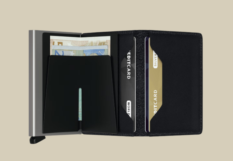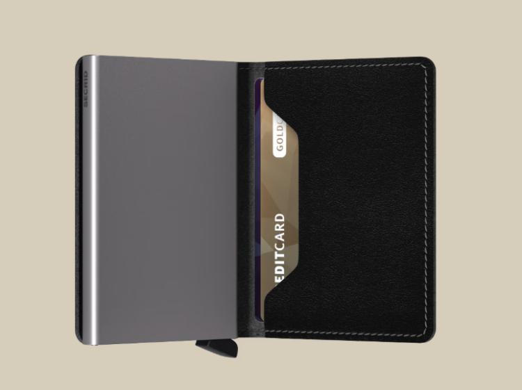 La Slimwallet è una rivisitazione moderna della classica billfold. Il suo profilo extra-sottile, senza bottone o sistema di chiusura a calamita, si adatta perfettamente a tutte le tasche. La pelle dal taglio generoso contiene almeno sei carte, banconote e biglietti da visita aggiuntivi.