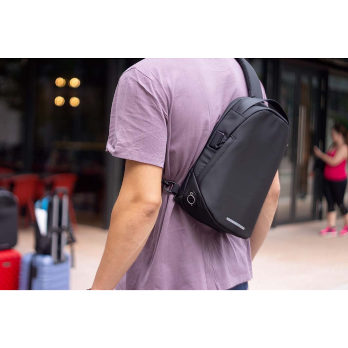 Zaino City Life Sling, ideale per la vita urbana e Hi-tech. Ideato per tutti coloro che trascorrono la maggior parte del tempo fuori casa per studio o per lavoro. Completamente impermeabile grazie al tessuto e alle zip idrorepellenti. Tessuto esterno realizzato con plastica riciclata. Dotato di numerosi scomparti, tasca antifurto e inserti riflettenti. Scomparto Tablet: 30x22cm. Litraggio: 7 L.